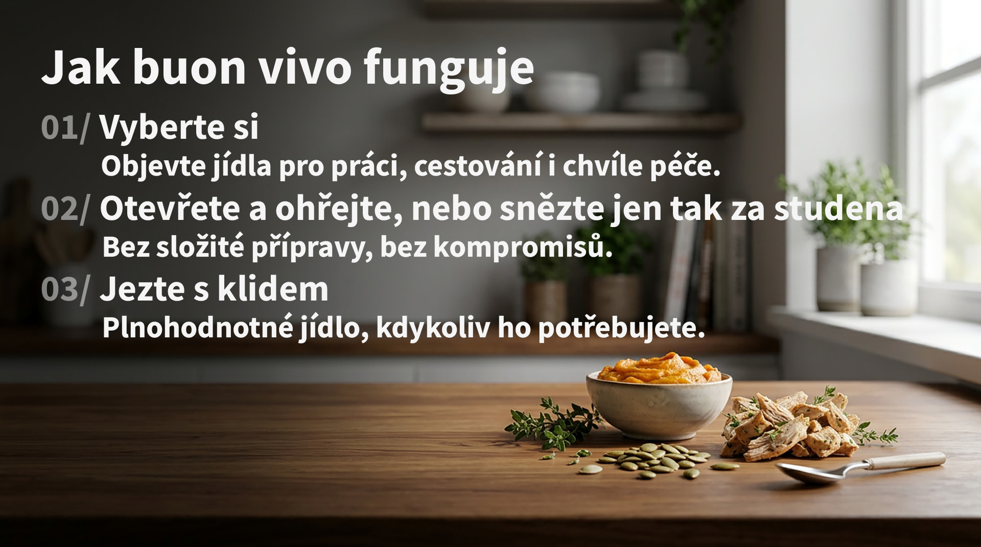 Jsou také ideální pro pacienty (i dočasné), kteří mají obtíže se žvýkáním z důvodu bolesti způsobené například zubními problémy (operace, rovnátka), ústními operacemi nebo mohou mít fobii z potravin v ústech (například kousky potravin). Naše jídla mají kašovitou konzistenci podle standardů IDSSI Level 4, obsahují dvě vrstvy (například maso a knedlíky) a lze je konzumovat při pokojové teplotě nebo krátce ohřát v mikrovlnné troubě.