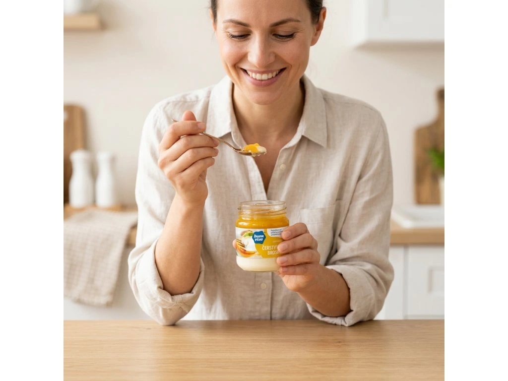 Nákyp z čerstvého sýru & broskví. Složení: Nákyp z čerstvého sýru [smetanový termizovaný sýr 35 % (mléko, jedlá sůl), zakysaná smetana, smetana, cukr, řepkový olej, voda, škrob, modifikovaný škrob, mléčná bílkovina, koncentrát citronové šťávy], broskvový nákyp 50 % (broskve 75 %, cukr, meruňky, voda, fruktózo-glukózový sirup, modifikovaný škrob, mléčná bílkovina, škrob, koncentrát citronové šťávy, koření, želírovací prostředek: pektin; regulátor kyselosti: kyselina askorbová; konzervant: sorban draselný].