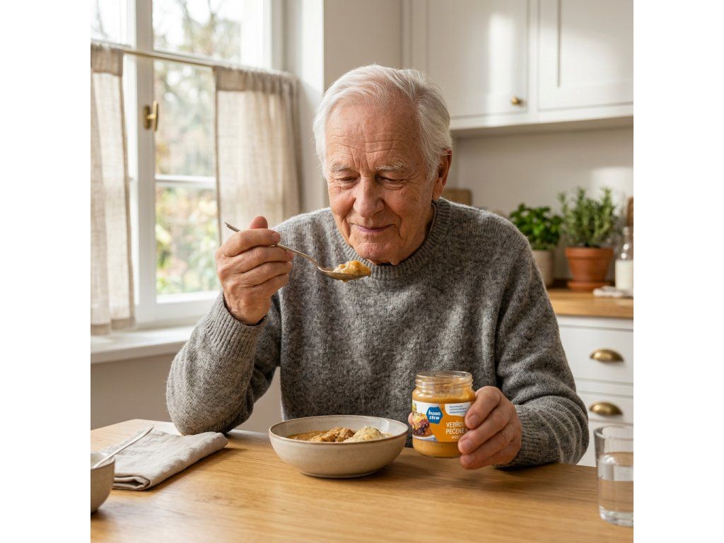 Každá sklenice obsahuje jemně mixované jídlo ve dvou vrstvách, navržené tak, aby odpovídalo potřebám dospělých – chuťově i nutričně.